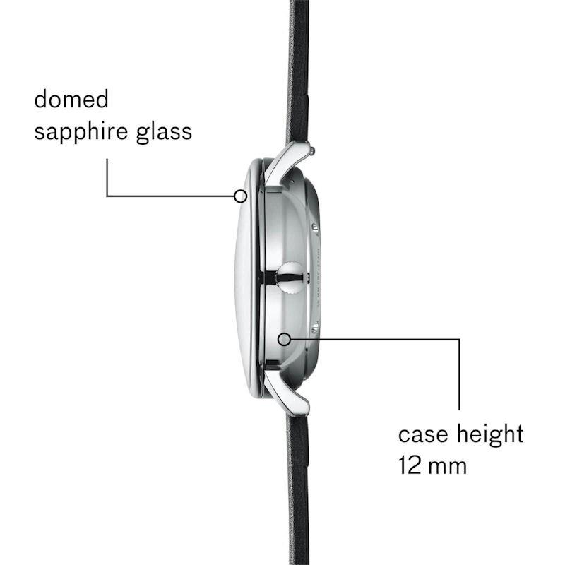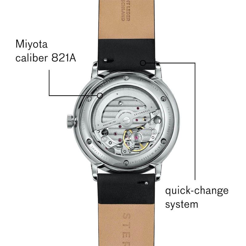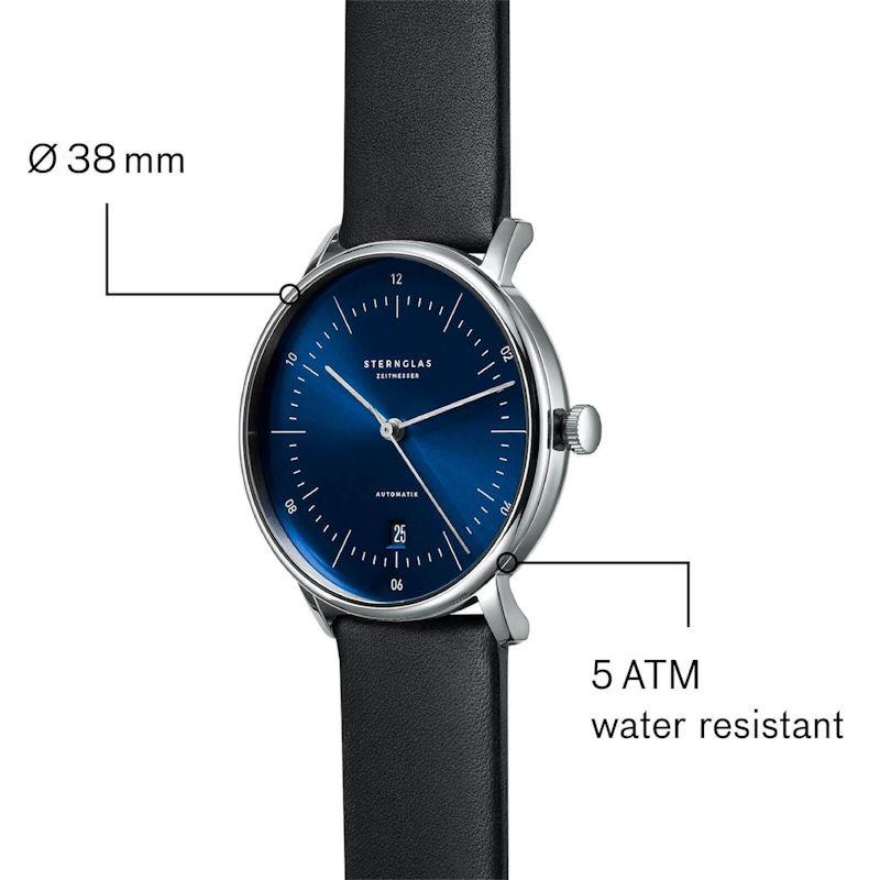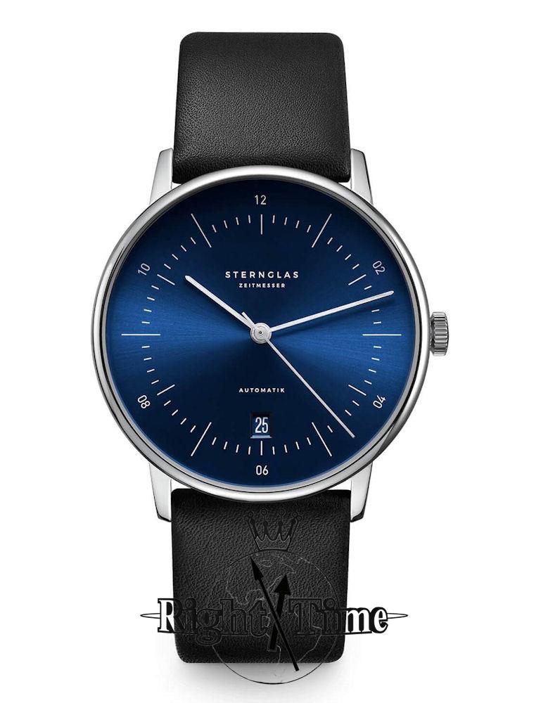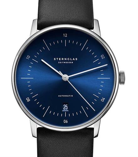Sternglas Naos watch model SNA21/108 powered by Japanese automatic movement. 316L stainless steel case with black leather band. Sapphire crystal. Blue dial with date. Water resistant to 50 meters.