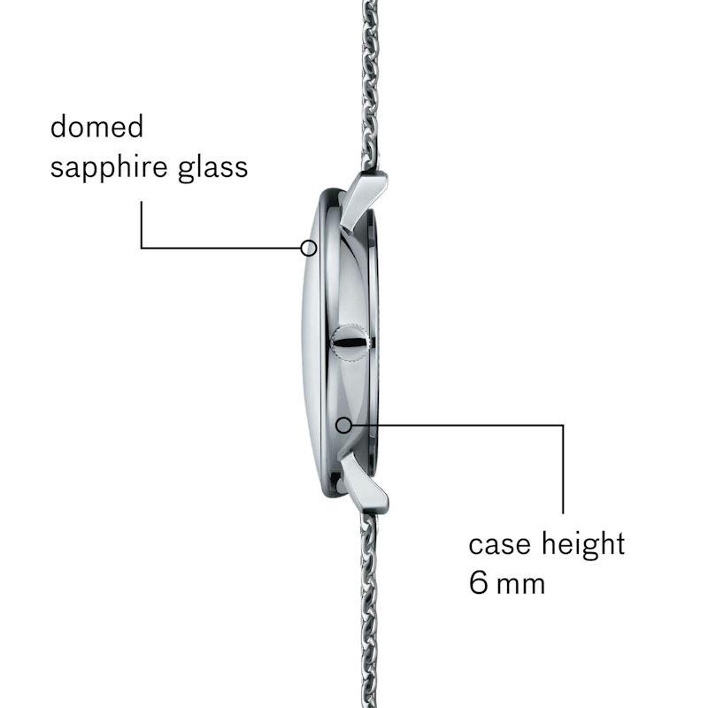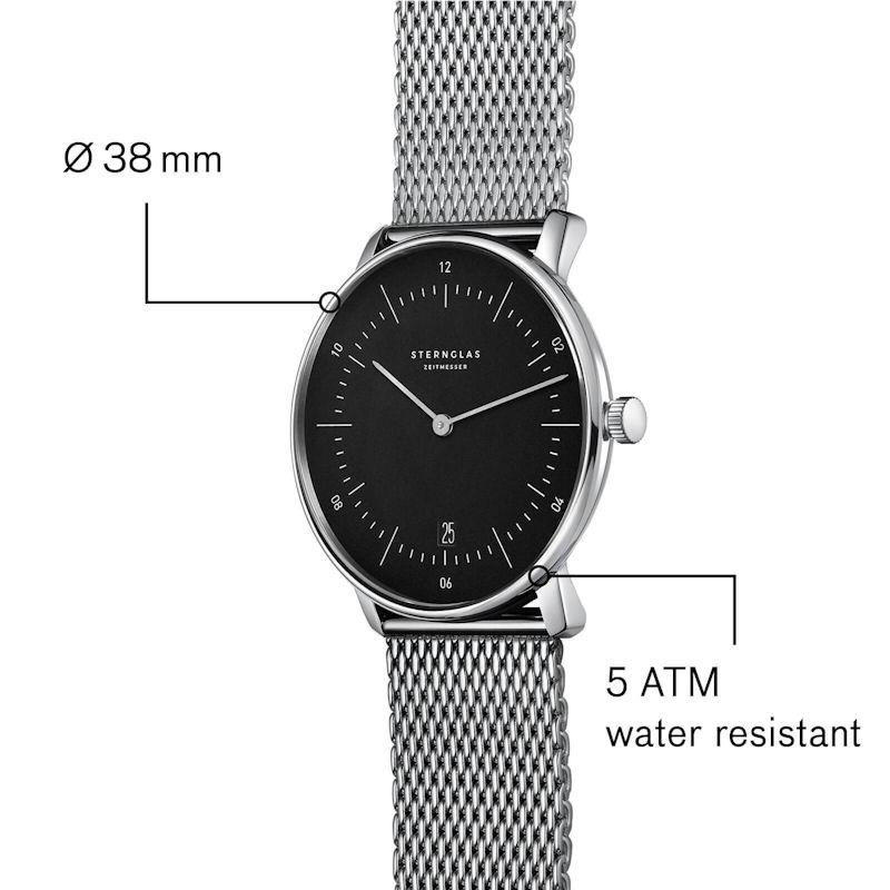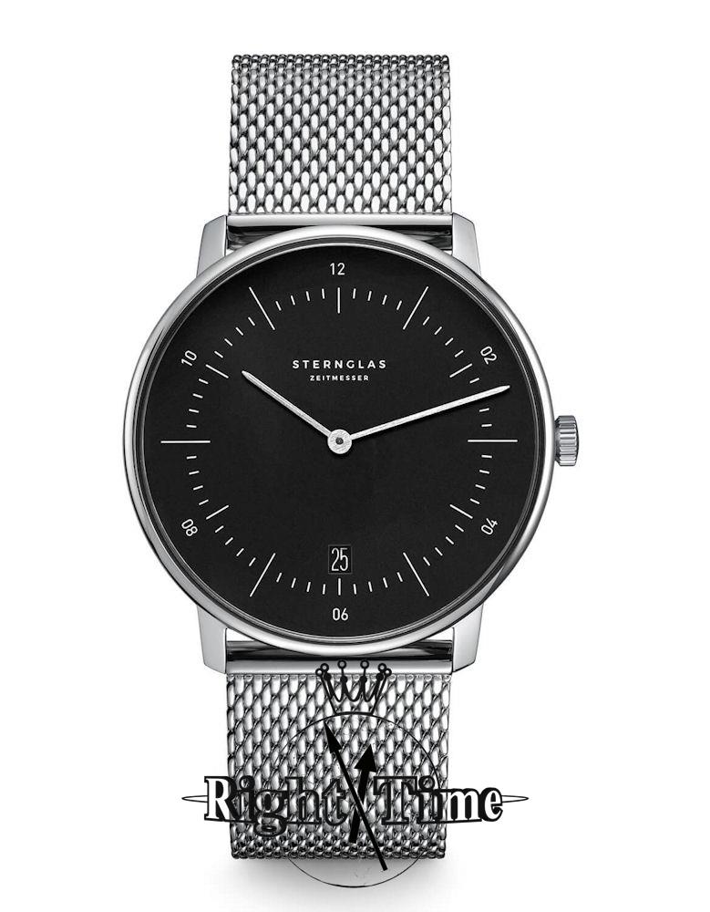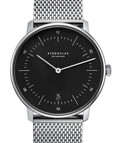 Sternglas Naos watch model SNQ11/403 powered by quartz movement. 316L stainless steel 38mm case with mesh bracelet. Sapphire crystal. Black dial. Water resistant to 50 meters.
