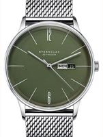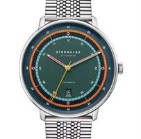 Sternglas Berlin watch model S01-BE08-MI04 powered by quartz movement. Inspired by the Berlin railway station in Hamburg in the 1850s. 316L stainless steel 38mm case with steel mesh bracelet. Sapphire crystal. Green tone dial with day/date calendar. Water resistant to 50 meters.