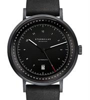 Sternglas Naos watch model SNA11/108 powered by Japanese automatic movement. 316L stainless steel case with black leather band. Sapphire crystal. Black dial with date. Water resistant to 50 meters.