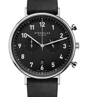 Sternglas watch model S01-CH03-VI15 powered by quartz chronograph movement. 316L stainless steel polished case with black leather band. Sapphire crystal. Black dial. Water resistant to 50 meters.