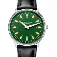 Sternglas Egor watch model S01-EG08-BR02 powered by quartz movement. 316L stainless steel 38mm case with black leather band. Sapphire crystal. Green dial with orange accents. Water resistant to 50 meters.