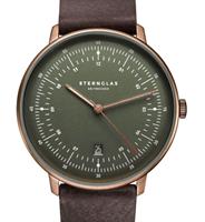 Sternglas Hamburg Edition Bronze watch model S01-HHR19-VI17 powered by quartz movement. Bronze plated 316L stainless steel 42mm ultra thin case with brown leather band. Sapphire crystal. Green dial. Water resistant to 50 meters.