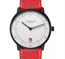 Sternglas Naos Edition Bauhaus III watch model S01-NAB15-CA02 powered by quartz movement. 316L stainless steel black PVD plated 38mm case on red leather strap. Sapphire crystal. White dial. Water resistant to 50 meters. Limited Edition of 1999 pieces.