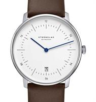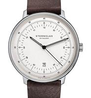 Sternglas Naos watch model SNA01/104 powered by Japanese automatic movement. 316L stainless steel case with brown leather band. Sapphire crystal. White dial with date. Water resistant to 50 meters.