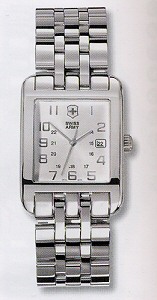 Swiss Army wrist watch model 24020 from Swiss Army Alliance Classic Line. Rectangular stainless steel curved case with Swiss Quartz movement, sapphire crystal, silver color dial with Arabic numerals and date calendar, stainless steel watch bracelet with deployment clasp and spring release.