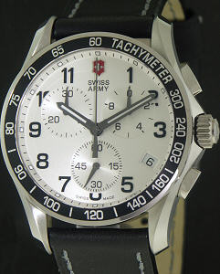 Swiss Army Chrono Classic watch model 241126 powered by Swiss quartz chronograph movement with date calendar. Silver color dial, black bezel with Tachymeter scale, stainless steel case, sapphire crystal, black leather watch strap.