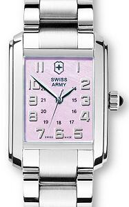Swiss Army 241169 small size watch from Swiss Army Vivante Collection. Rectangular stainless steel case with pink Mother-of-Pearl dial and Arabic numerals. Sapphire crystal. Stainless steel watch bracelet.