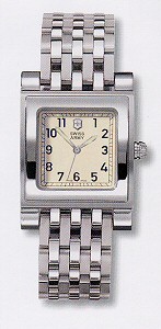 Swiss Army Lady wrist watch model 24124 from Swiss Army Cavalier Line. Stainless steel square case with Swiss Quartz movement, date calendar on ivory color dial with Arabic numerals, luminous hands and markers, stainless steel watch bracelet. Water resistant to 50 meters.