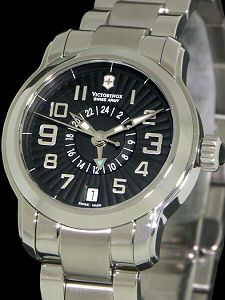 Swiss Army lady "Vivante" collection. Quartz watch with 2nd time zone 24 hours hand and date calendar. Black textured dial, steel case and bracelet with spring loaded deployant clasp, sapphire crystal, cabochon stone crown, 100m water resistant.
