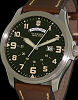 Swiss Army Infantry Vintage Day/Date quartz watch. Large 44mm steel case. Military green color dial with large luminous Arabic numerals. Sapphire crystal. Brown leather watch band. Water resistant to 100 meters.