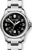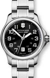 Victorinox Swiss Army Small Officer`s black dial. 28mm stainless steel case with bracelet. 100 meters water resistant. Silver markers and hands. Date calendar.