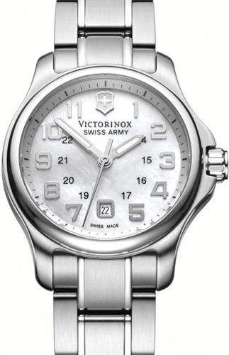 Victorinox Swiss Army Small Officer`s white Mother-of-Pearl dial. 28mm stainless steel case and bracelet. 100 meters water resistant. Date calendar.