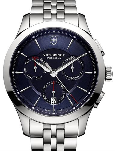 Victorinox Swiss Army Alliance watch model 241746 powered by Swiss quartz chronograph movement with date calendar at 6 o`clock position and day-of-week sub-dial at 9 o`clock. Blue color dial with luminous hands and markers. Stainless steel case and watch bracelet, sapphire crystal.