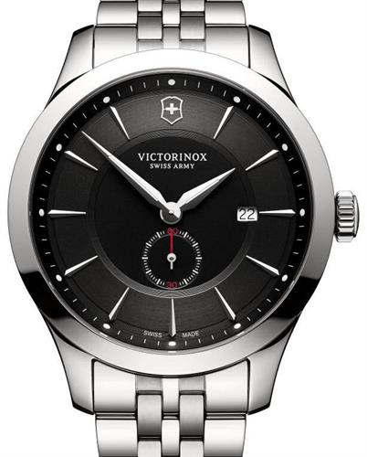Victorinox Swiss Army Alliance watch model 241762 powered by Swiss quartz movement with date calendar at 3 o`clock position and small seconds sub-dial at 6 o`clock position. Black dial. Stainless steel case and watch bracelet. Sapphire crystal.