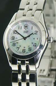 Swiss Army Lady wrist watch model 24180 from Swiss Army Alliance Classic Line. Stainless steel highly polished case with Mother-of-Pearl dial, Swiss Quartz movement with date calendar, sapphire crystal, Arabic numerals, stainless steel polished watch bracelet with center opening deployment clasp and spring release.