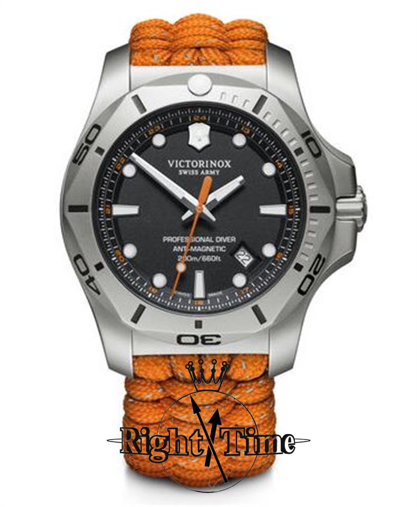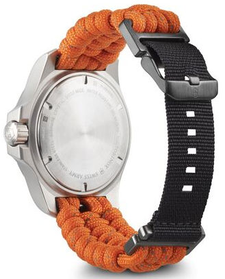 Victorinox Swiss Army I.N.O.X. (Impact Neutralizing Object for the X-tremes) model 241845. Sandblasted stainless steel case with uni-directional bezel. Swiss Quartz analog movement with date function. Black dial with luminous hands and markers. Comes as a set with both an orange genuine rubber, and an orange Paracord strap. Sapphire crystal. Diver rated to 200 meters.