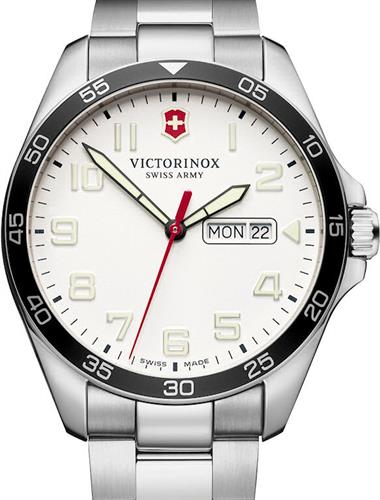 Victorinox Swiss Army Field Force watch model 241850. Powered by Swiss quartz movement with day/date calendar. Solid stainless steel case with bracelet and black bezel. White color dial.
