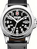Swiss Army Infantry quartz watch. 38mm steel case. Black dial with large luminous Arabic numerals. Sapphire crystal. Black leather watch band. Water resistant to 100 meters.