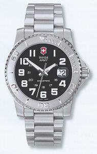 Swiss Army diver wrist watch model 24702 from Swiss Army Maverick II Line. Swiss Quartz movement, stainless steel case with steel unidirectional bezel, screw-down crown, sapphire crystal with date magnifier, luminous bezel marker, hands and markers on black color dial with Arabic numerals, date calendar, stainless steel watch bracelet. Water resistant to 200 meters.