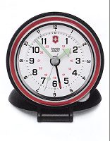 Swiss Army Travel Alarm Clock model 24731 with second time zone. Quartz movement, black synthetic case, white dial with red ring, large Arabic numerals, luminous hands and 5 min markers
