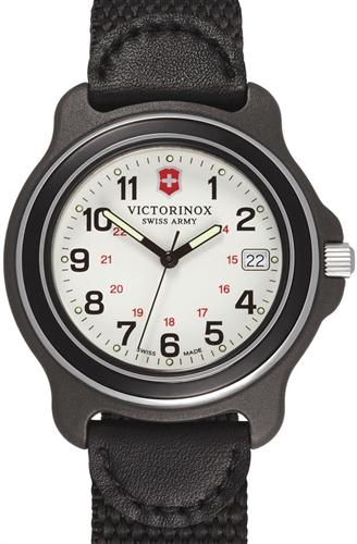 Swiss Army Men`s wrist watch model 249089 from Victorinox Swiss Army Original Line. Black synthetic 39mm case with screw in case back. Swiss Quartz movement, mineral crystal, white dial with Arabic numerals, black nylon strap. 100 meters water resistant