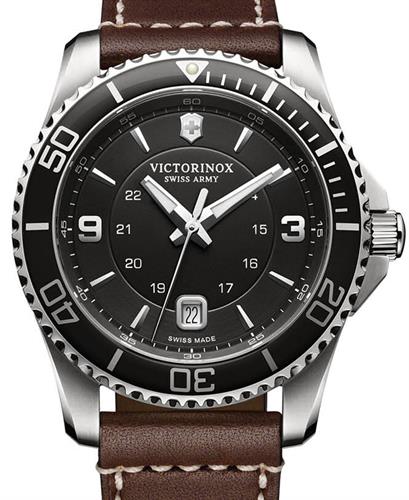 Swiss Army watch model 249107 from Swiss Army Maverick Line. Swiss Quartz movement, 43mm stainless steel case with black unidirectional bezel, sapphire crystal, black color dial with Arabic numerals, brown leather band. Water resistant to 100 meters.