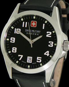 Swiss Military Hanowa quartz men`s size watch with date calendar model 06-4030-04-007 from Swiss Military Hanowa Tomax collection. 100 meters water resistant. Stainless steel case, luminous hands, Arabic markers, black color dial, black leather watch band.