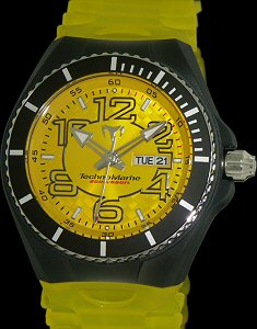 Technomarine Cruise 3-Hand watch. Quartz movement with day/date calendar, steel 316L case with black gel cover, uni-directional rotating bezel, yellow dial with carbon fiber texture, yellow gel strap with quick-release feature. Water resistant to 200 meters.