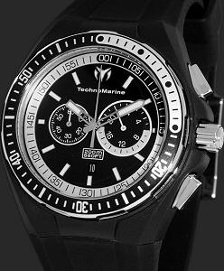 Technomarine Cruise quartz chronograph watch with 24-hours hand. Large 45mm steel 316L case with black gel cover, one-way rotating bezel, black color dial with silver color accents, black gel strap with quick-release feature. Water resistant to 200 meters. Comes with additional white strap.