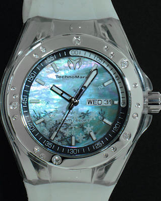 Technomarine ladies Cruise Sport Snow 110064 with 19 diamonds on a uni-directional rotating bezel. Blue mother of pearl dial with white and gray snowdflakes. Luminous hands and hour markers. Stainless steel case on a white silicone band. 20 atmospheres water resistant.