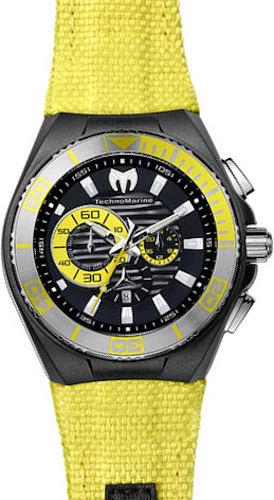 Technomarine Cruise Locker quartz chronograph watch. Black PVD steel 316L case with black gel cover, one-way rotating 0-60 bezel with yellow accents, black color dial with yellow sub-dial and luminous markers, yellow watch strap. Set comes with two additional bands. Water resistant to 200 meters.