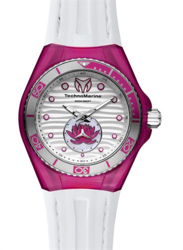 Technomarine Cruise Original Beach 2 model. Quartz movement. 40mm 316L stainless steel case with pink cover. Pink and grey plated bezel. White textured dial with pink flower. White silicone strap