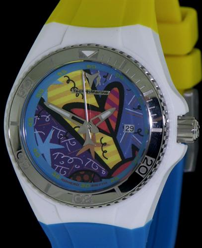 Technomarine Cruise Romero Britto paintings limited edition of 450 pieces 113041 model. Quartz movement. 40mm 316L stainless steel case with 3 different covers and changeable bands. Blue and other Britto colors dial with. Gift/storage box with glass lid