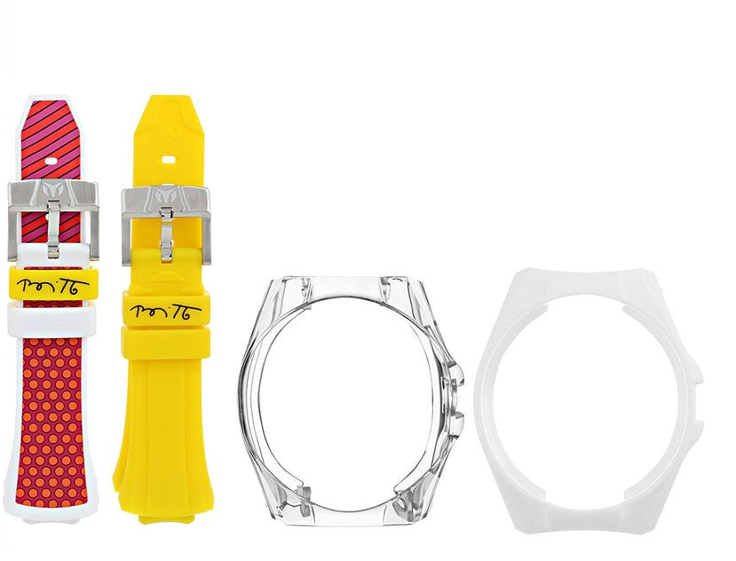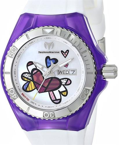 Technomarine Cruise Beach quartz watch. Steel 316L case with purple gel cover, one-way rotating 0-60 bezel, white color dial with Mother-of-Pearl and printed Britto pattern of flying hearts. Water resistant to 200 meters. Comes in a set with extra cover and silicon straps