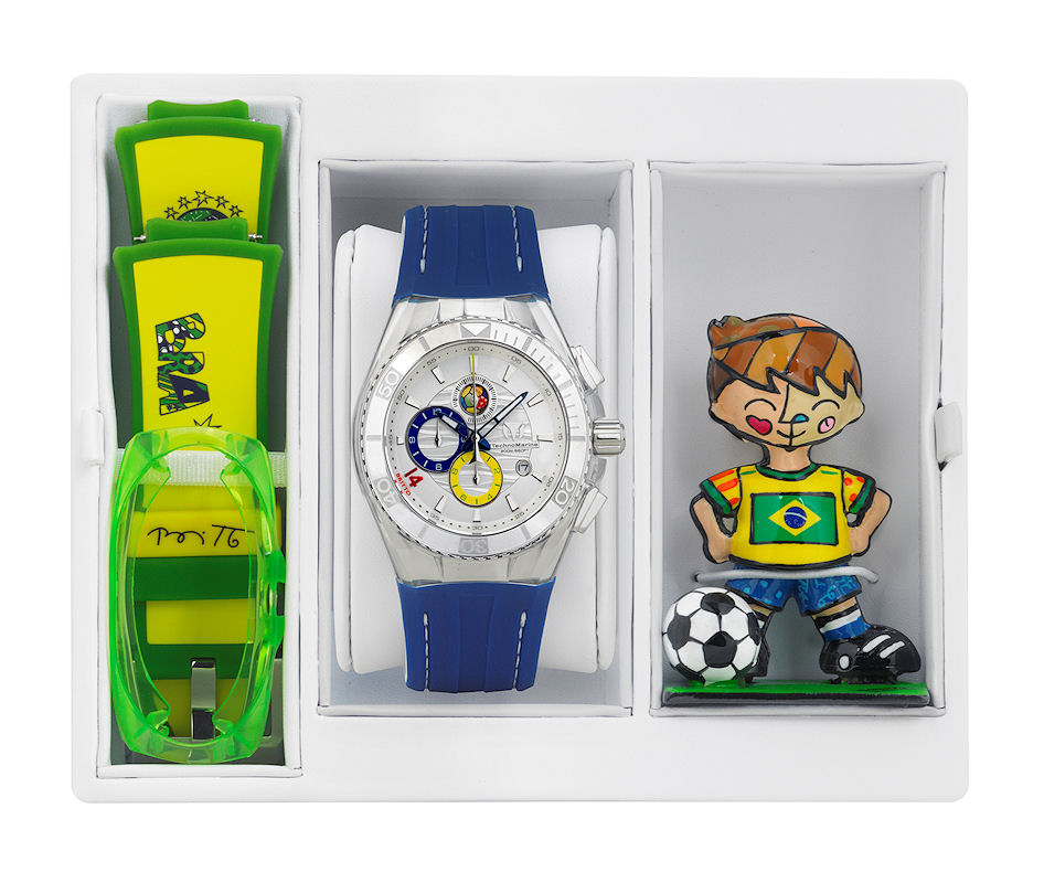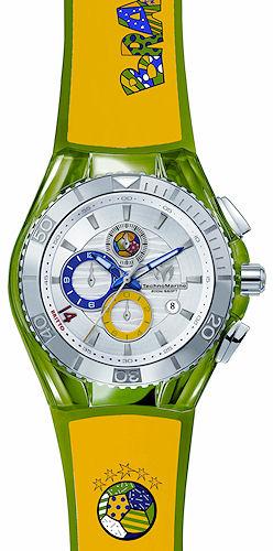 Technomarine Britto Soccer Ball quartz chronograph watch. "Brazil Edition." Steel 316L case with green gel cover, one-way rotating 0-60 bezel, silver color dial with blue and yellow sub-dials and Britto ball at 12 o`clock sub-dial. Water resistant to 200 meters. Comes in a set with extra silicon strap