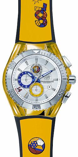 Technomarine Britto Soccer Ball quartz chronograph watch. "Colombia Edition." Steel 316L case with light yellow gel cover, one-way rotating 0-60 bezel, silver color dial with blue and yellow sub-dials and Britto ball at 12 o`clock sub-dial. Water resistant to 200 meters. Comes in a set with extra silicon strap