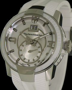 Technomarine UF6 quartz watch model 609002 with large date calendar at 12 o`clock. Stainless steel case with white carbon inserts on sides and bezel. Steel color textured dial with Mother-of-