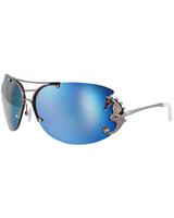 Lightweight sunglasses from Technomarine Hyppocampus Collection. 100% UV Protection. Silver tone frame with blue color lens. Temples attached to lens by small "Sea Horse" decorated with Swarovski crystals.