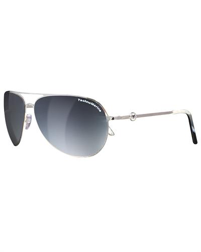 Lightweight pilot sunglasses, flexible and ready for your adventures. Technomarine Cruise Steel Collection. 100% UV Protection. Silver tone frame with grey lens and Technomarine logo.