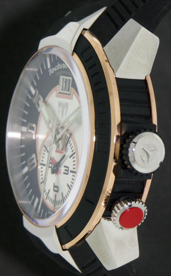 Technomarine UF6 dual time quartz watch model UFDT2G with large date calendar at 12 o`clock. Stunning combination of polished stainless steel and rose gold plated finish case with black carbon inserts on sides and bezel. Black and steel color dial with second time zone sub-dial at 6 o`clock position. Black soft silicone watchband.
