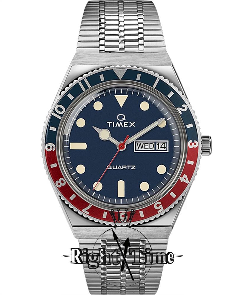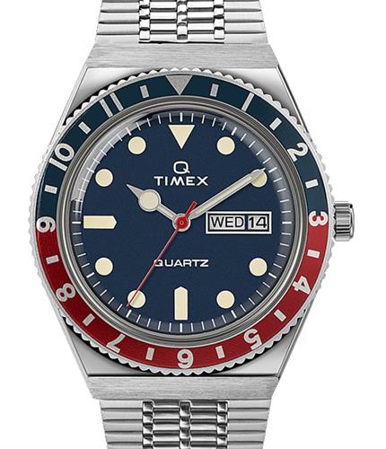 Q Timex Reissue 38mm stainless steel watch with bracelet powered by quartz movement. Blue dial with day/date calendar. "Pepsi" red and blue bezel. Water resistant to 50 meters