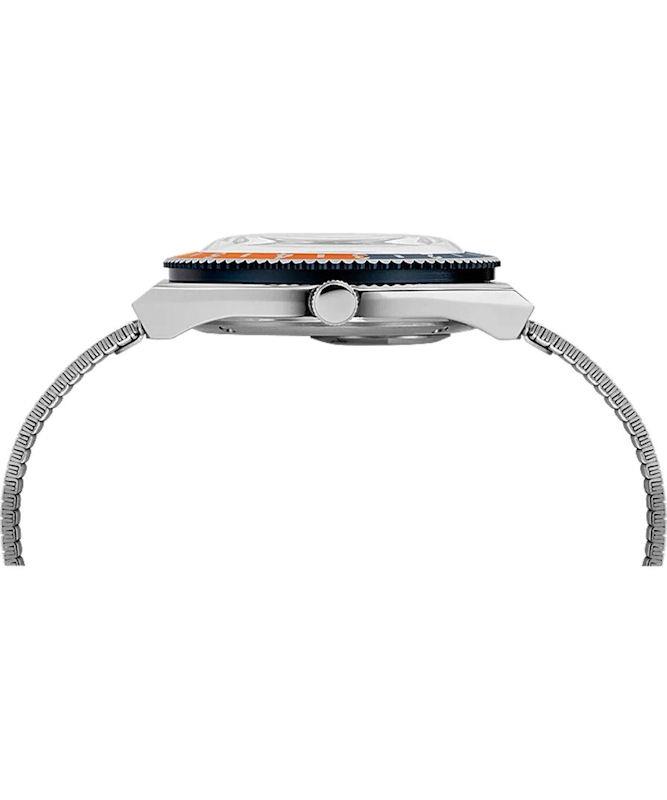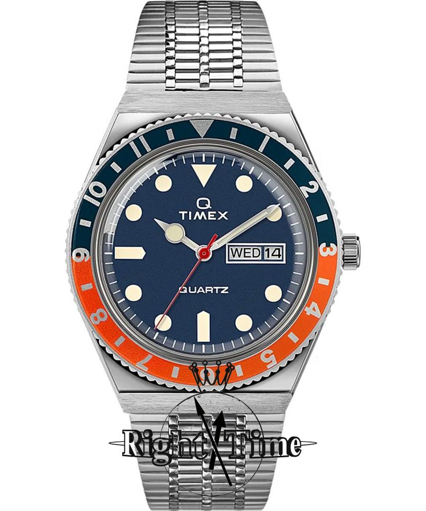 Q Timex Reissue 38mm stainless steel watch with bracelet powered by quartz movement. Blue dial with day/date calendar. Blue and orange bezel. Water resistant to 50 meters