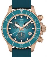 Tissot Seastar 1000 model T120.217.37.041.00. Swiss made quartz analog movement with date and chronograph function. Rose gold PVD coated solid stainless steel case with uni-directional 60 minute bezel. Graded turquoise dial with luminous hands and markers. Sapphire crystal. Water resistant to 30bar. Comes on a turquoise rubber watch strap.