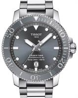 Tissot Seastar 1000 Chronograph model T120.417.17.081.01. Swiss made quartz analog chronograph movement. Solid stainless steel case with a uni-directional 60 minute bezel and grey silicone strap. Grey dial with steel tone luminous hands and markers. Sapphire crystal. Water resistant to 30bar.