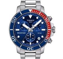 Tissot Seastar 1000 Chronograph model T120.417.11.041.03. Swiss made quartz analog chronograph movement. Solid stainless steel case with a uni-directional 60 minute bezel. Blue dial with steel tone luminous hands and markers. Sapphire crystal. Stainless steel bracelet. Water resistant to 30bar.