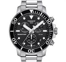 Tissot Seastar 1000 Chronograph model T120.417.11.051.00. Swiss made quartz analog chronograph movement. Solid stainless steel case and bracelet with a uni-directional 60 minute bezel. Black dial with steel tone luminous hands and markers. Sapphire crystal. Water resistant to 30bar.