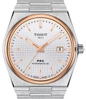 Tissot PRX model T137.410.11.031.00. Swiss made quartz analog movement. Tonneau shaped solid stainless steel case and bracelet. Sapphire crystal. Silver color dial with rose gold tone luminous hands and markers. Water resistant to 100 meters.
