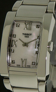Tissot T007.309.11.116 Generosi-T quartz watch. Polished steel case and bracelet, white Mother-of-Pearl dial with diamond and Roman markers, quartz movement with date.