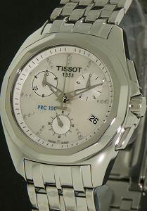 Tissot ladies quartz sport-dress chronograph model with white Mother-of-Pearl dial, diamond markers, 100m water resistance, polished stainless steel case and bracelet